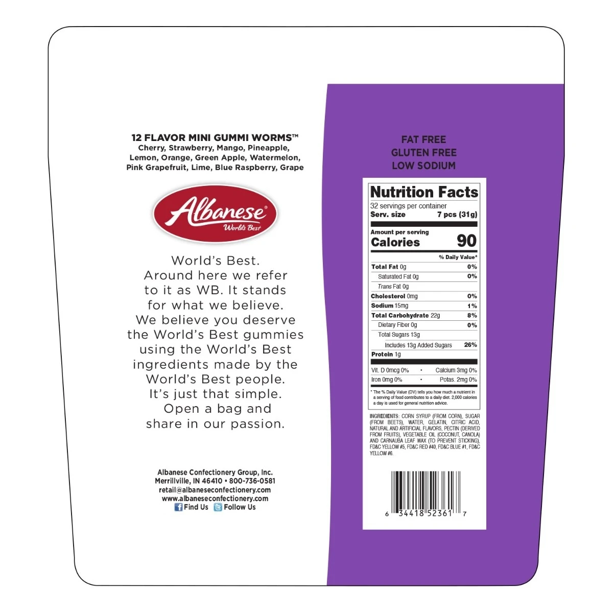 12 Flavor Mini Gummi Worms: Cherry, Strawberry, Mango, Pineapple, Lemon, Orange, Green Apple, Watermelon, Pink Grapefruit, Lime, Blue Raspberry, Grape.
