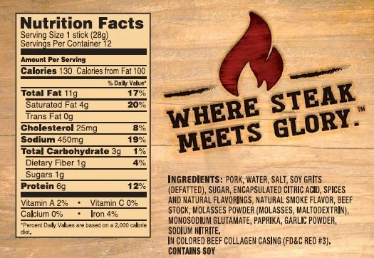 Pork, Water, Salt, Soy Grits (DEFATTED), Sugar, Encapsulated Citric Acid, Spices and Natural Flavorings, Natural Smoke Flavor, Beef Stock, Molasses Powder (Molasses, Maltodextrin), Monosodium Glutamate, Paprika, Garlic Powder, Sodium Nitrite.