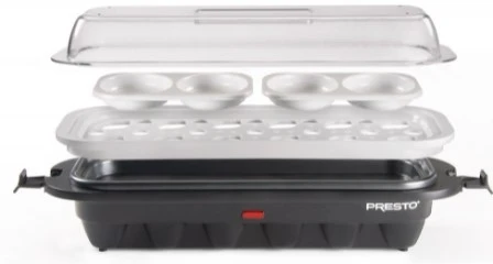 Makes up to 12 hard-, medium-, or soft-boiled eggs in minutes. Dual poaching trays steam up to four eggs at once.
