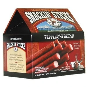 Pepperoni Snackin’ Sticks Kit: Each kit contains (2) 3.0 oz. seasoning packets; (2) 4.2 oz. cure packets; (2) strands of 21 mm collagen casings, enough to do up to 20 lbs of meat!