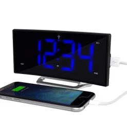Atomic time with the newest technology; This alarm clock has a blue curved display which offers a larger and easier to read display at all angles. Easy-to-use charging port for your phone while you sleep.