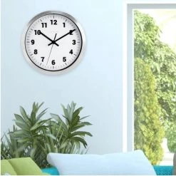 This La Crosse wall clock has a metal frame (silver finish) and metal hands which is protected by a glass lens.