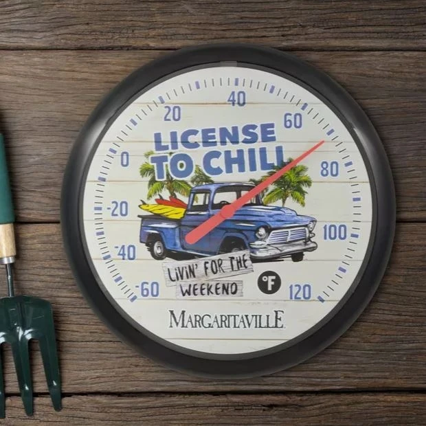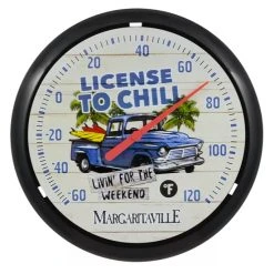 With it’s vintage-truck, beachfront vibes, the La Crosse® License To Chill Margaritaville Round Dial Thermometer is sturdy enough for the outdoors but sharp enough to hang inside. Easily mounted on a screw or nail head with its built-in keyhole, the extra-large 13.5″ diameter thermometer reads temperatures from -60°–120°F. Protected by a shatter-resistant lens, this thermometer is as at home on the family room wall as it is on the dock, and it lets you know the temperature at a glance. Keep out of direct sunlight and precipitation for most accurate readings.