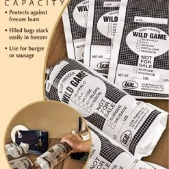 Pack your wild game meat the easy way. LEM 2 Pound Wild Game Bags are quality opaque, polyethylene bags with a 1 1/2″ bottom gusset for added burst protection. The heavy 2 mil thickness guards against freezer burn. When filled and frozen, they stack neatly in the freezer. “NOT FOR SALE” is printed on all bags. 100 count.