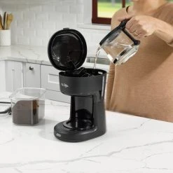 - Compact design is great for small spaces; updated ergonomic carafe offers easy pouring and handling, and features ounce markings for perfect measuring