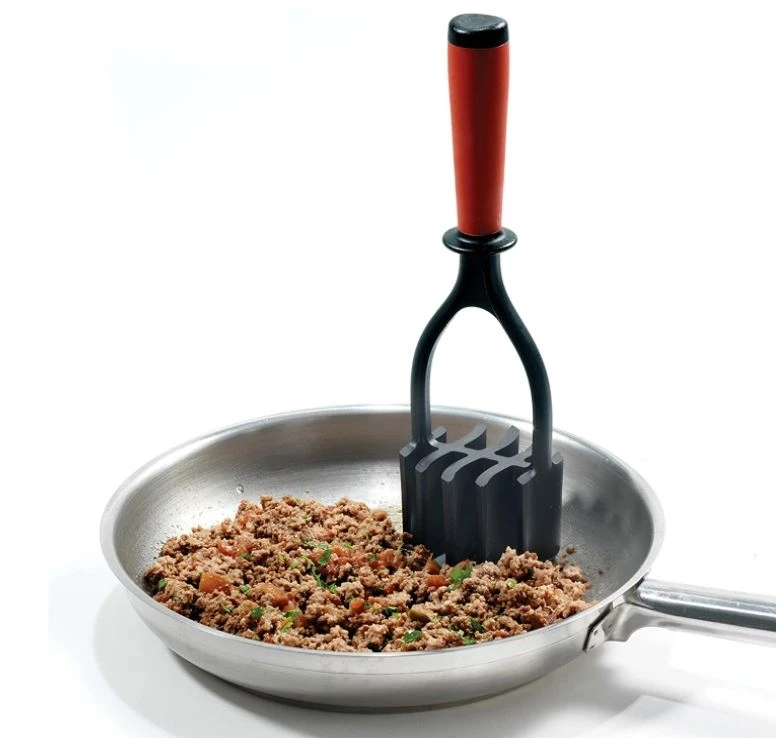 The ultimate food chopper! 5 blades in 1, doing the work for you! The unique beveled, wavy shape breaks down foods quickly and easily as it’s being cooked. Using a chop & twist motion, quickly break down ground beef, turkey or sausage into a fine consistency as it cooks, chopping and stirring at the same time while mixing in seasonings, sauces or vegetables quickly! A time saver when making homemade tacos, chili, and spaghetti sauce, or sausage gravy, right in your frying pan! Easily breaks down tomatoes for sauces, avocado for guacamole or mash potatoes quickly! Also great for making cauliflower mash! Great for breaking down boiled eggs for egg salad, cooked vegetables for healthy option meals and mashing homemade apple sauce! Long sturdy handle is great for use in deep dishes or crock pots! Safe for nonstick cookware. High heat resistant to 450°F / 230°C.