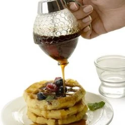 A sophisticated alternative to those pudgy plastic honey bears, this honey dispenser releases a thin drizzle of honey into your tea or steamed milk or on top of toast, hot cereal, pancakes or cornbread. The dispenser is made of glass, not plastic, with an attractive honeycomb relief. When you press the spring trigger, which is attached to the lid, honey flows from the glass nipple at the bottom of the dispenser. Release the trigger and an inner stopper mechanism closes to prevent drips. Keep the inside of the stand honey-free, and avoid overfilling the container. To prevent honey from forming a crust at the bottom, limiting the flow, rinse the glass nipple after use. To liquefy congealed honey, run warm water over the glass. This simple item will quickly become indispensable at your breakfast table.