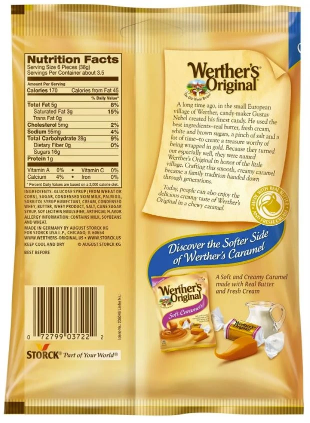 Enjoy the smooth texture and classic flavor of Werther’s candy irrestiabily chewy caramels. Werther’s Original is made with only the finest ingredients blended together with the same passion and care our first candy maker, Gustav Nebel, brought to every candy he crafted. Made with real butter and fresh cream, for a one of a kind taste.